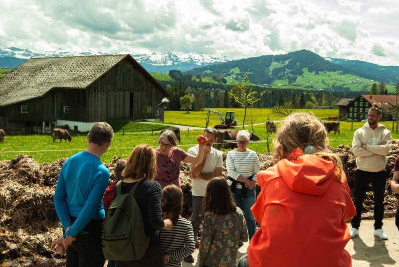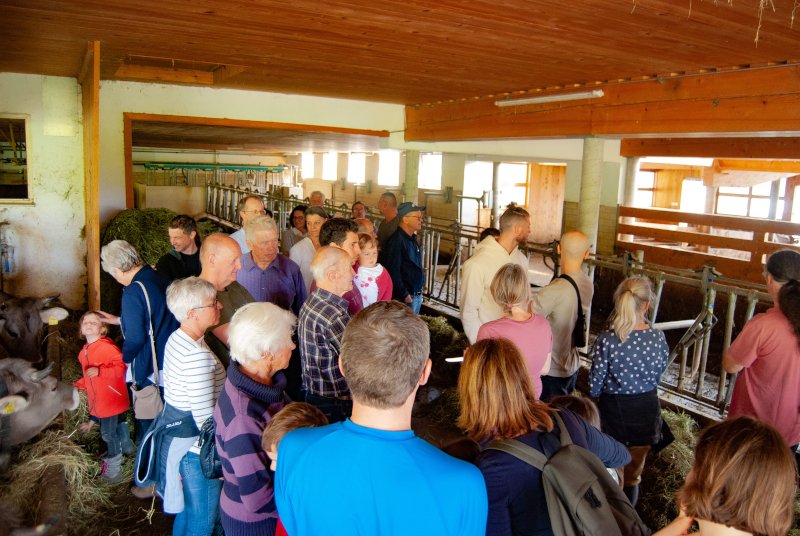 Weiter beim Stall begrüßt der Bulle lautstark die eintretenden Gäste. „Dies hier ist eine alte Rinderrasse, das Braunvieh. Zwar ist die Milchleistung geringer und sie wachsen langsamer, aber sie sind robust“, erklärt Agate. Das Braunvieh kommt ursprünglich aus der Alpenregion und ist deshalb hier in Vorarlberg gut aufgehoben. Die Tiere können sich frei im und aus dem Stall bewegen. Auf den Einsatz von Kraftfutter wird verzichtet. Die Tiere werden in Mutterkuhhaltung gehalten, wodurch die Kälber nicht an der Flasche gezogen werden, sondern bei der Mutterkuh bleiben und sich dort ernähren.