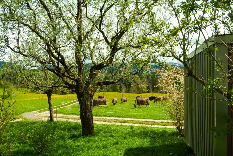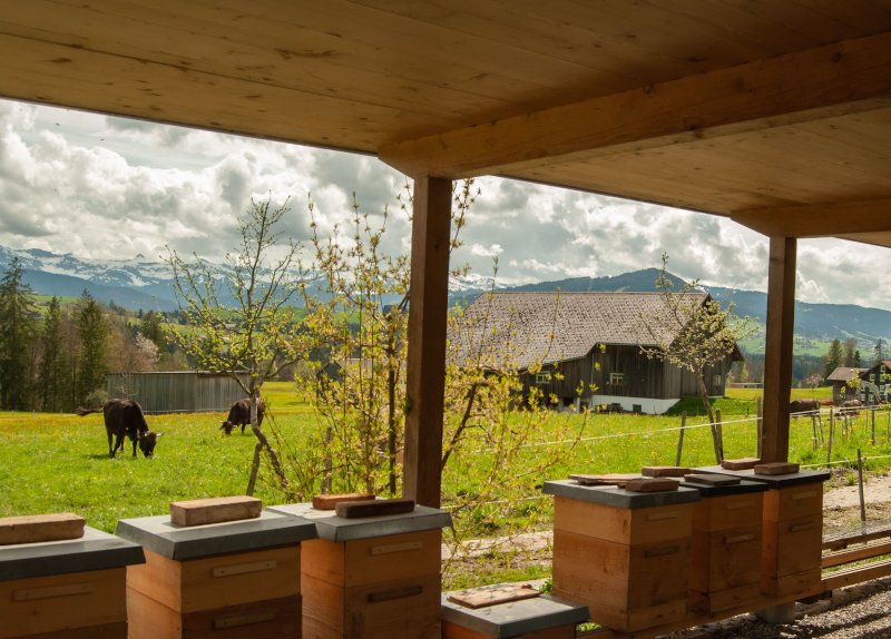 Über die Scheunentür wird der Stall zur hinteren Seite des Hauses verlassen. Im Hintergrund weiden die Rinder vor den Berggipfeln und der Stallmist wird vor dem Ausbringen auf die Felder am Stall gelagert und regelmäßig gewendet, denn für die Umbauprozesse benötigen die Mikroorganismen genügend Sauerstoff. Neben Obstbäumen und Gemüsegarten werden hier auch Bienenvölker gepflegt.