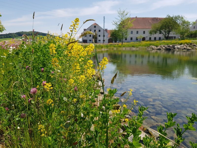 In der Vergangenheit gab es rund um den Bauernhof wenige natürliche Strukturen. Es wurde darauf geachtet, dass alles feinsäuberlich gemäht ist, um nach außen zu vermitteln, dass der Hof in Schuss ist. Johann Schauer hat sich von dieser Sichtweise abgekehrt und lässt wieder mehr „schlamperte“ Bereiche entstehen. In einem Naturschutzprojekt mit dem Land Oberösterreich wurde ein Teich angelegt, Hecken und Bäume gepflanzt und Blumenwiesen angesät. Die Bemühungen zeigen bereits Erfolge: Johann Schauer beobachtet jetzt wesentlich mehr Insekten und Blütenbesucher auf seinen Wiesen. Der BIO-Bauer engagiert sich auch in seiner Gemeinde für mehr Biodiversität. Als Gemeinderat hat er erreicht, dass die Gemeinde eine Bienenfreundliche Gemeinde wird. Er schaut darauf, dass es auch im und rund um den Ort wieder mehr Bienenwiesen gibt. Auf einigen öffentlichen Flächen konnte er regionales Wildblumensaatgut anbauen und so für mehr Blütenangebot sorgen.