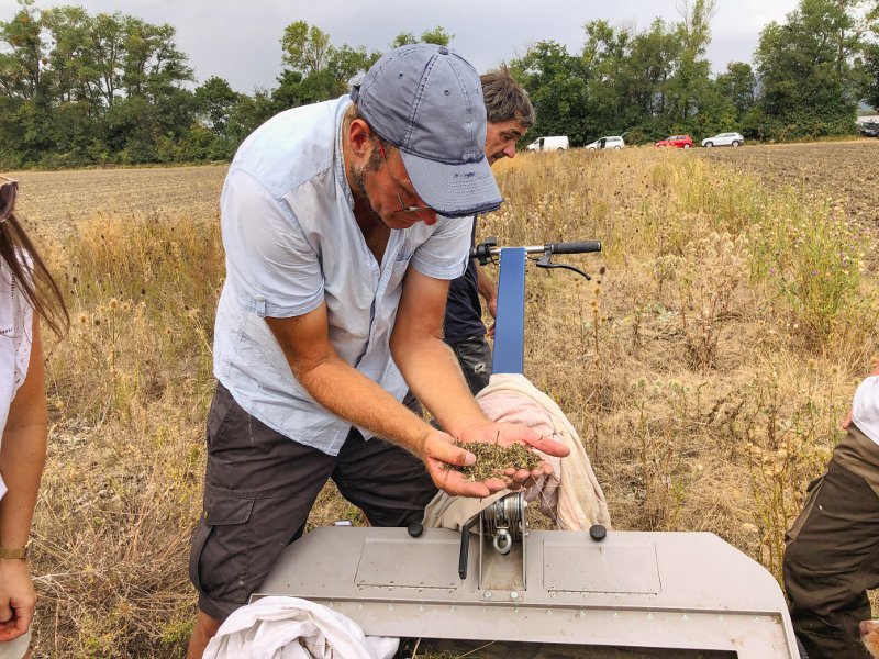 Damit sich eine Blühfläche möglichst gut entwickelt, ist die Wahl des richtigen Saatguts entscheidend. Im Idealfall besteht es aus regionalen, standortangepassten Wildpflanzen. Ein Gerät, das dabei hilft, den Samen von Wildpflanzen zu ernten, ist der eBeetle. Der eBeetle ist ein handgeführtes, einachsiges Gerät zur Beerntung artenreicher Wiesen. Reife Samen werden mittels einer rotierenden Bürste schonend aus den Pflanzen herausgebürstet. Die Räder des eBeetles werden über einen Elektromotor angetrieben. Der Vorteil der maschinellen Ernte gegenüber dem händischen Einsammeln von Samen ist die Geschwindigkeit: Mit dem eBeetle ist man 5- bis 10-mal schneller. Im Rahmen des Bauernhofspaziergangs bei Rudi Schmid demonstrierte Harald Schau vom REWISA-Netzwerk den „flinken Käfer“ bei seinem Einsatz auf einer von Rudis Ackerbrachen.