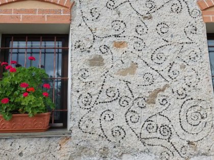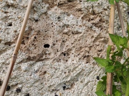 Selbst auf der mit Schlackenputz verzierten Hausfassade des historischen Hofgebäudes finden Wildbienen in den vielen kleinen Nischen geeignete Nistmöglichkeiten.