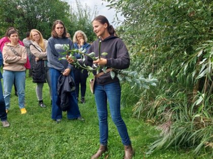 Eine Hecke u.a. mit Zierquitte, Felsenbirne, Aronia, Dirndl oder Schwarzlaubigen Hollunder, im Unterwuchs mit Fetthenne und Frauenmantel liefert Brigitte schmackhafte Früchte, farbenprächtige Blüten und schönes Blattwerk, das sie auf unterschiedlichste Weise weiterverarbeiten kann. „Eine große Vielfalt an Pflanzen mit unterschiedlichen Blühzeiten versorgen Bienen und andere Insekten das ganze Jahr über mit Pollen, Nektar und Früchten“, unterstreicht auch Hans Neumayer die Bedeutung vielgestaltiger Hecken. „Besonders wertvoll sind auch Frühblüher wie die Weide“, betont Hans, Wildbienen- und Hummelexperte, der uns auf unserem Spaziergang begleitet. Die frühblühenden Kätzchen liefern zu einer Jahreszeit Nektar und Pollen, in der andere Blüten noch rar sind. Auch daran mangelt es bei Brigitte nicht. Gleich sechs verschiedene Weidensorten hat sie angesetzt. Für sie als Floristin ist die Weide beim Kränze binden eine nachhaltige, umweltschonende Alternative zum Steckschwamm.