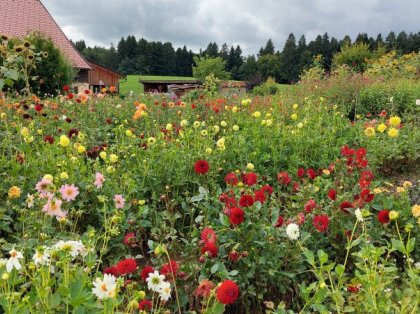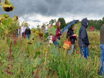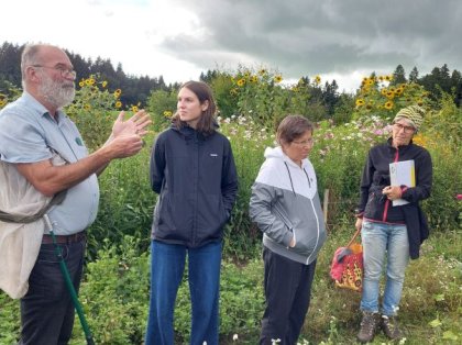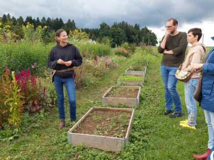 Bereits bei der Begrüßung wird für die rund 20 Teilnehmer*innen des Bauernhofspaziergangs spürbar, wofür Brigittes Herz brennt: Blumenproduktion im Einklang mit Ursprünglichkeit, Regionalität und Saisonalität – vom Samenkorn übers Blumenfeld bis hin zur Trockenblume. Brigitte zeigt damit einen innovativen Weg auf, wie Blumenproduktion auch funktionieren kann, weit weg von der Monotonie der Industrieblumen und vor allem ohne Einsatz von Pestiziden oder Hormonen, die bei Industriepflanzen genutzt werden, um den Reifegrad der Pflanzen auf den langen Transportwegen zu stoppen.