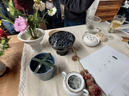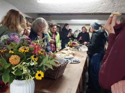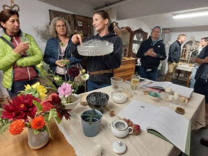 Schließlich findet unser Spaziergang einen gemütlichen Ausklang im Hofladen, wo wir handgefertigte Blumen-Kunstwerke von Brigitte bewundern können. Steckigel (Kenzan) und Vasen oder alte Lampenschirme befüllt mit Hasendraht sind für Brigitte dabei dekorative und v.a. mikroplastikfreie Alternativen zum Steckschwamm.