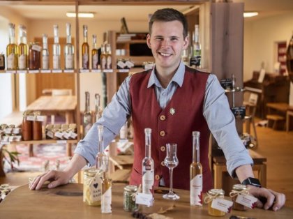 BIO-Bauer und Biodiversitäts-Botschafter Jakob Mayer zeigte seinen Betrieb und erzählte, warum ihm Vielfalt besonders wichtig ist. Der Betriebsschwerpunkt liegt in der extensiven Obstproduktion, -verarbeitung und -Direktvermarktung, das Leitprodukt ist die Elsbeere.